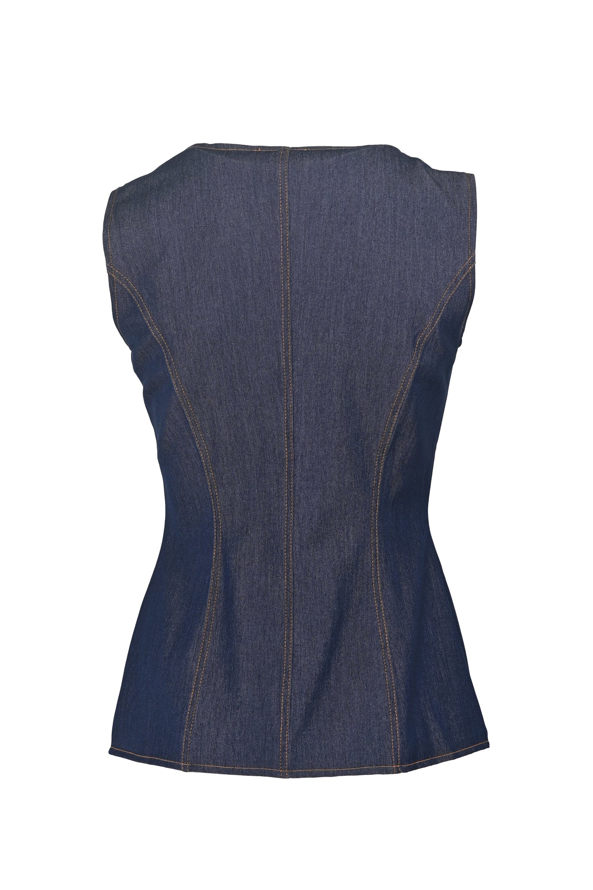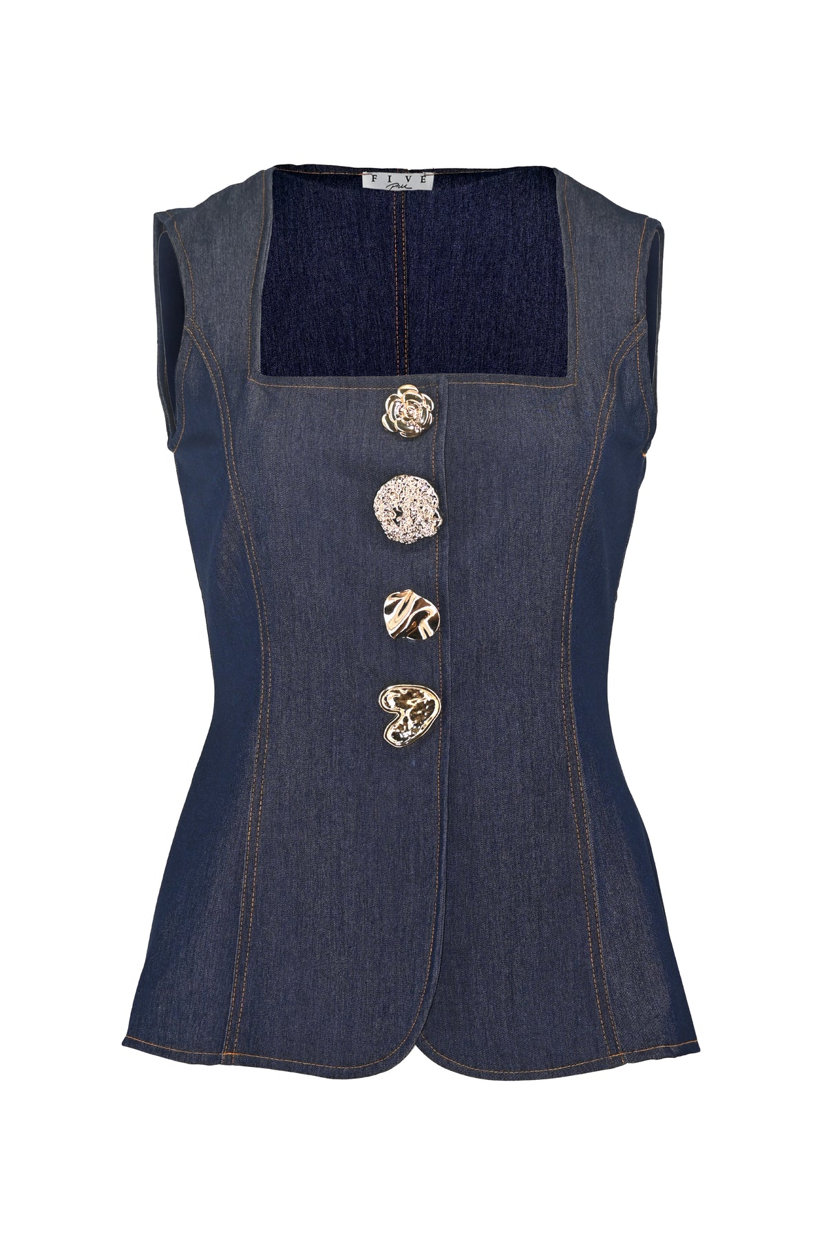 The Deadline Jean Vest elevates classic denim with three distinctively shaped golden buttons, creating a refined focal point. Its elegant ruffled button placket adds subtle texture and sophistication, making this vest a timeless statement piece that enhances any wardrobe with understated charm.