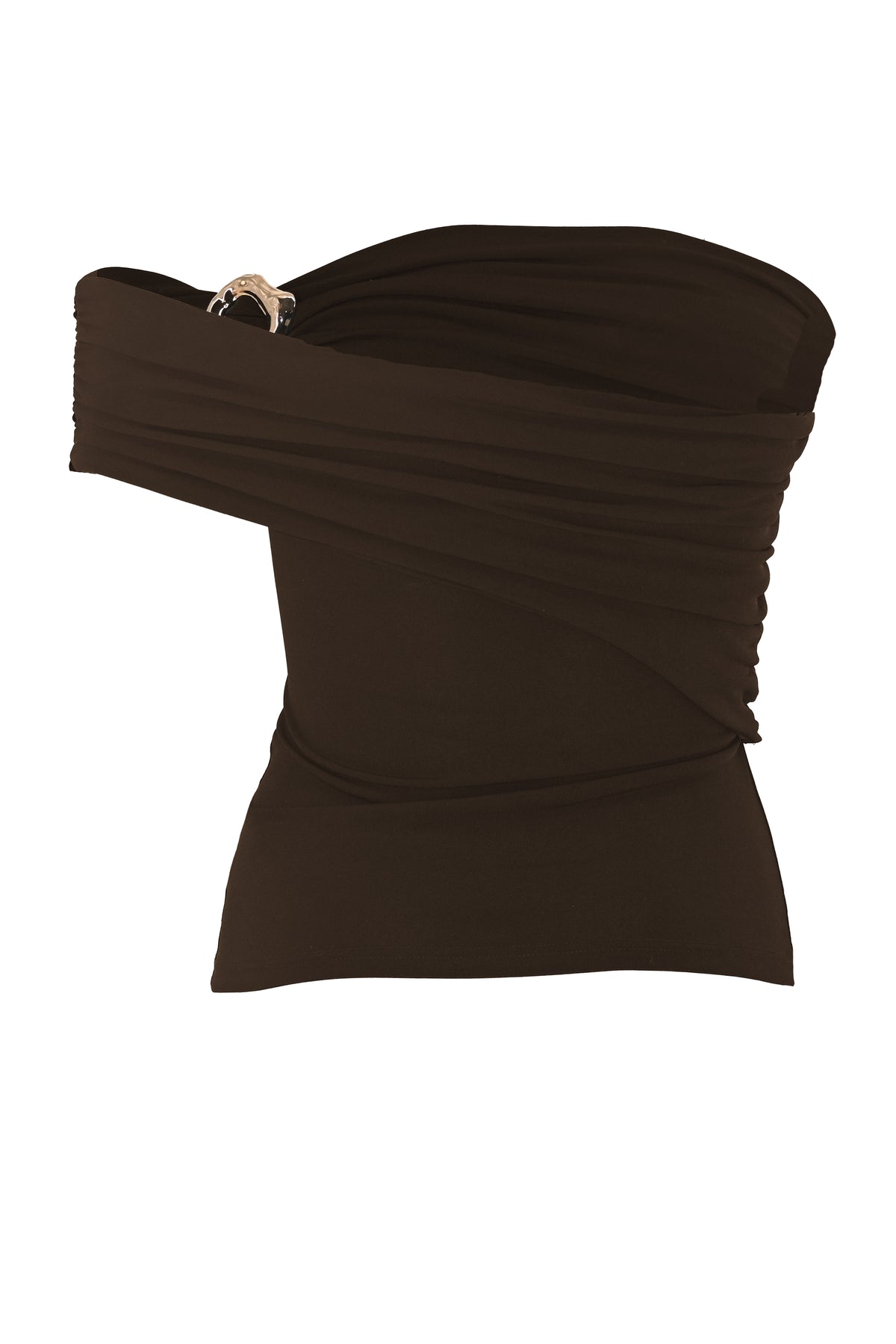 This daring black top features a striking side sleeve that elegantly wraps around the shoulder, accented with a bold golden accessory. Its unique design adds an edge to your outfit, making it perfect for confident, standout looks. Elevate your style with this statement piece.